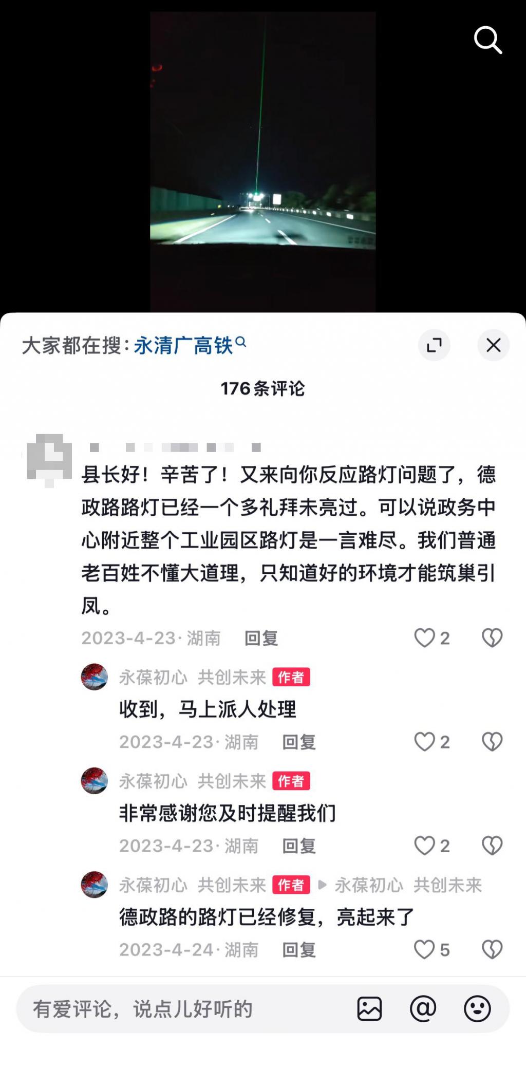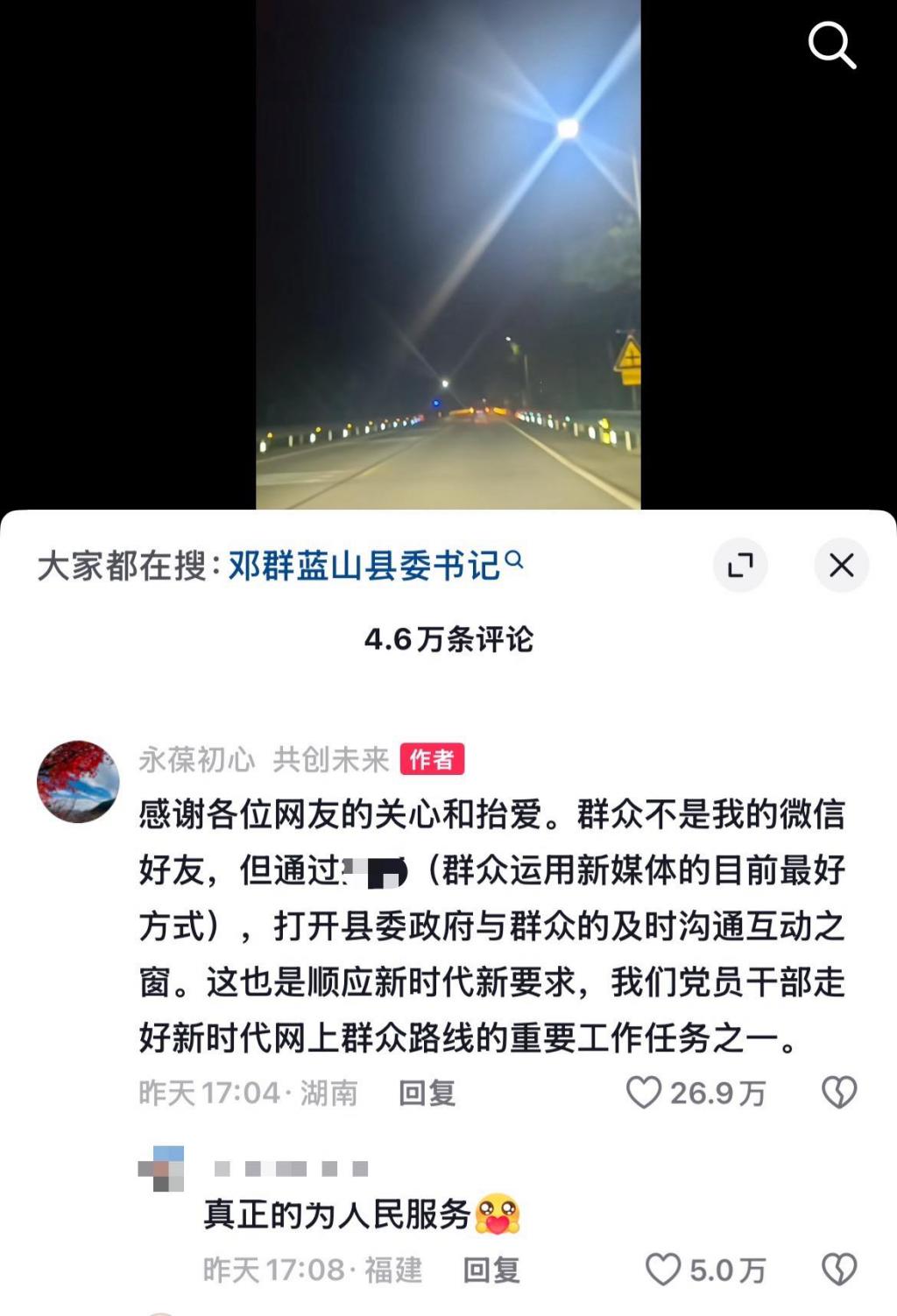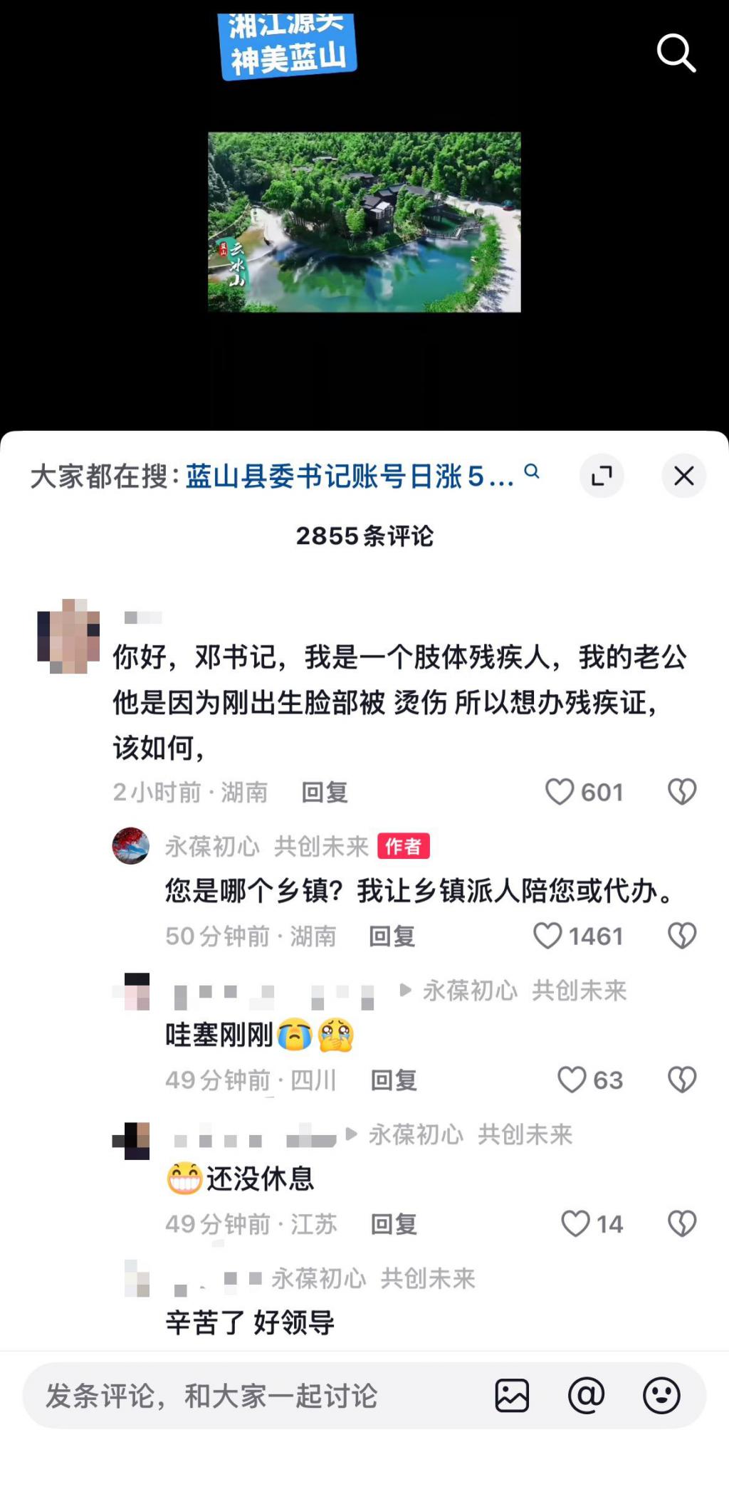因为在短视频账号上回复网友意见、解决群众诉求,湖南省永州市蓝山县委书记邓群的账号成了当地的 " 问政平台 "。经媒体报道后,大量网友涌入评论区,有人提意见建议,有人表达敬意和关心。