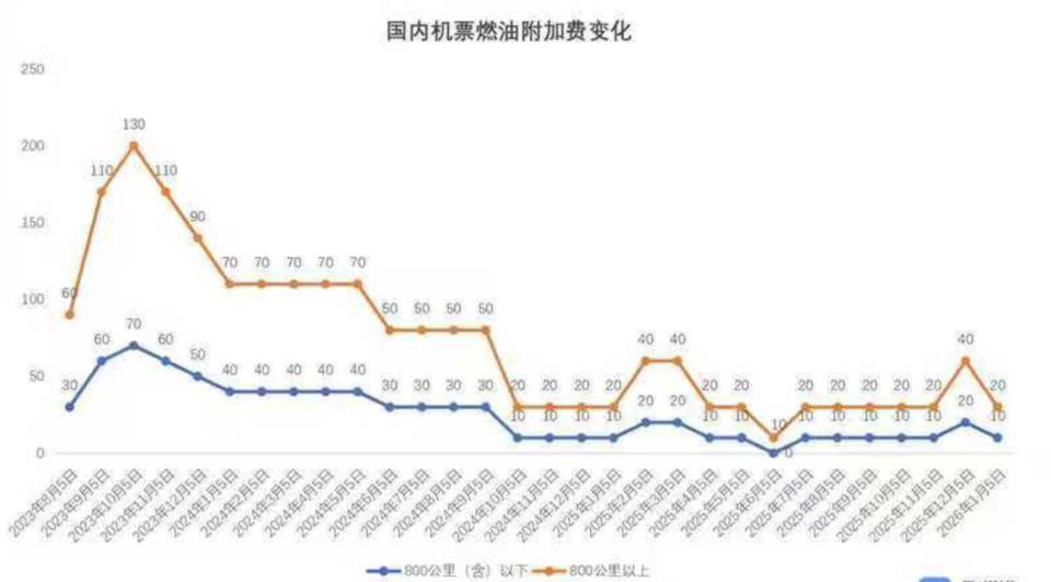 国内航司的国内航线燃油附加费是每月调整一次的节奏,以国内航空煤油综合采购成本为基准,低于 5000 元 / 吨时停收,高于 5000 元 / 吨开始征收,超出基准部分的 20% 由航司自行消化,旅客承担 80%。