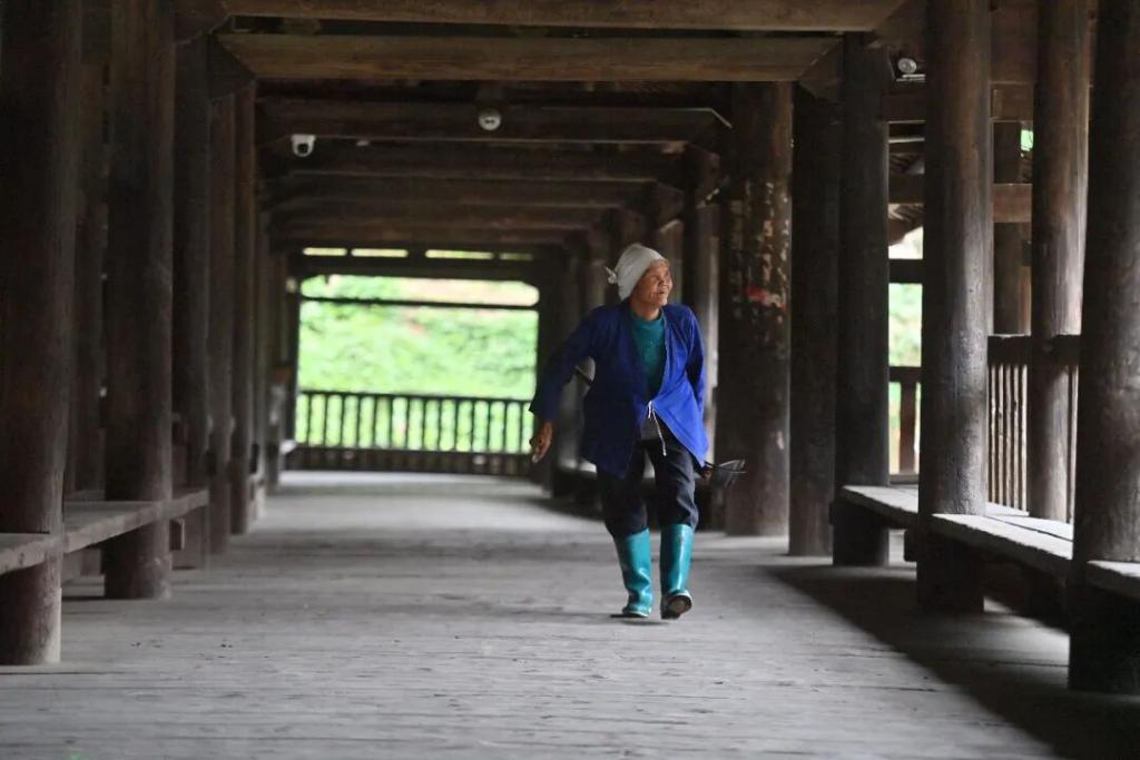 提高农民参保率,成为维系城乡居民养老保险可持续的关键。图为老人在风雨桥上经过 / 新华社记者 黄孝邦 摄