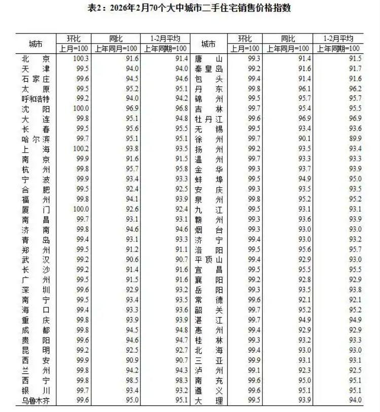 3 月 16 日,国家统计局公布的 2026 年 2 月 70 个大中城市商品住宅销售价格变动情况显示,新房销售价格环比上涨或持平城市个数比上月增加,一线城市由环比下降转为持平,其中北京、上海均环比上涨 0.2%。70 个大中城市中,新建商品住宅销售价格环比上涨城市有 10 个。