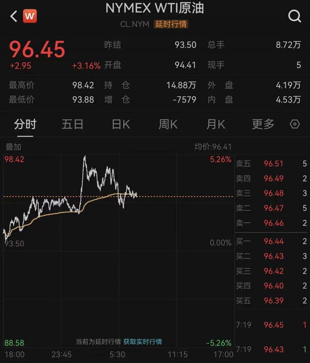 北京时间 3 月 17 日午间,继 16 日晚大跌后,WTI 原油期货、布伦特原油期货大幅反弹,WTI 原油期货一度涨超 5% 报 97.6 美元 / 桶,截至发稿,涨幅回落至 3.16%,报 96.45 美元 / 桶;布伦特原油期货一度涨近 5% 报 104.84 美元 / 桶,截至发稿,涨幅回落至 2.92% 报 103.14 美元 / 桶。