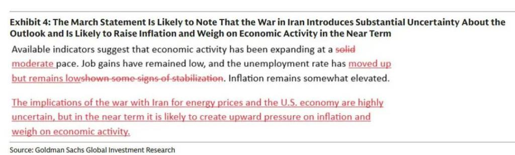 高盛认为,FOMC 声明可能会承认伊朗战争增加了前景的不确定性,并可能在短期内推高通胀并拖累经济活动。声明还可能将活动增长描述为 " 温和 " 而非 " 稳健 "。鉴于最新的就业消息,委员会可能会适度下调其对劳动力市场的描述。