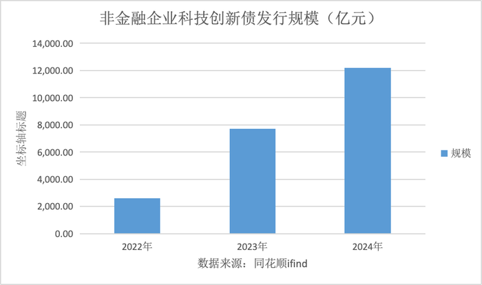 同花顺iFind数据显示,2022年科技创新债发行规模为2608亿元,2023年增长至7716亿元,2024年进一步增长至12179亿元,呈现快速增长的态势。