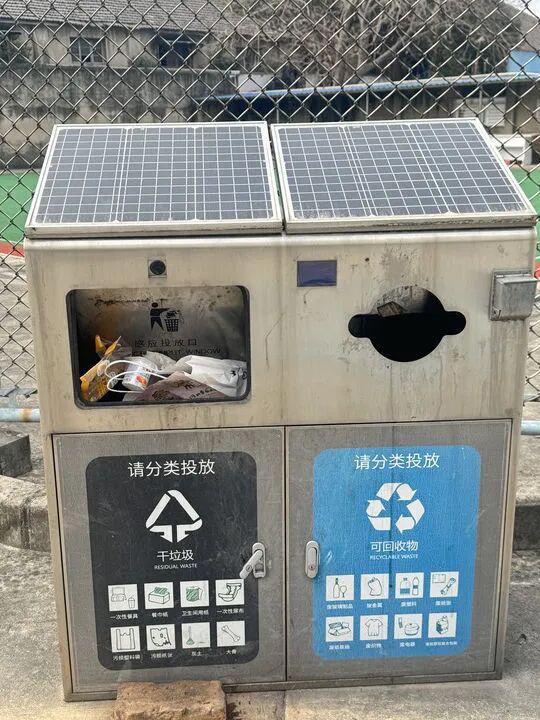 在该城市的一所重点高校校园内,设置了大量带有太阳能板的 " 二分类智能物联环卫箱 "。这些垃圾箱配备自动感应投放口、电子屏等功能,电子屏幕会实时显示 " 今日投放 "" 今日清桶 " 次数等数据。