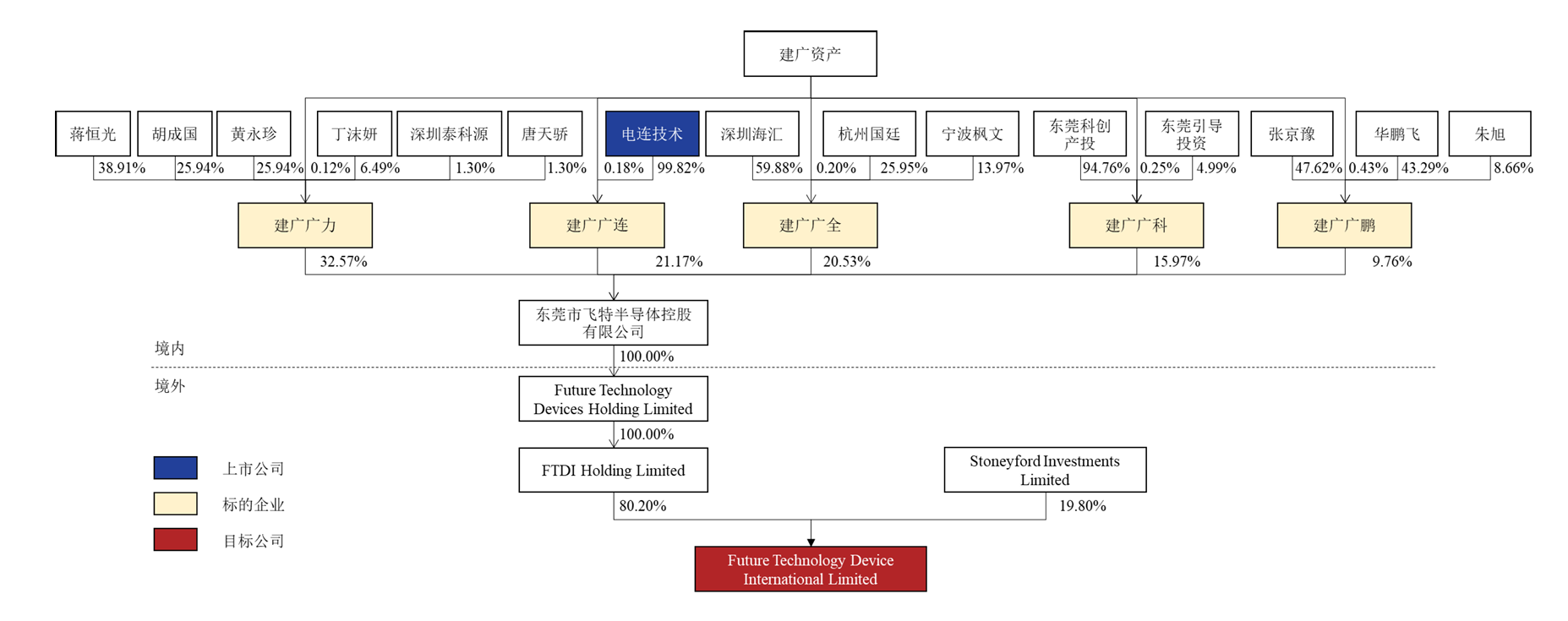 据界面《硬科技头条》今年2月报道,2021年12月,包括电连技术、华鹏飞等上市公司在内的中资财团,通过东莞飞特设立的全资孙公司FTDIHL收购英国USB桥接芯片公司FTDI (Future Technology Devices International)80.2%股权,交易金额约4.14亿美元;其余19.8%股权仍由创始人团队持有,并继续主导公司经营。