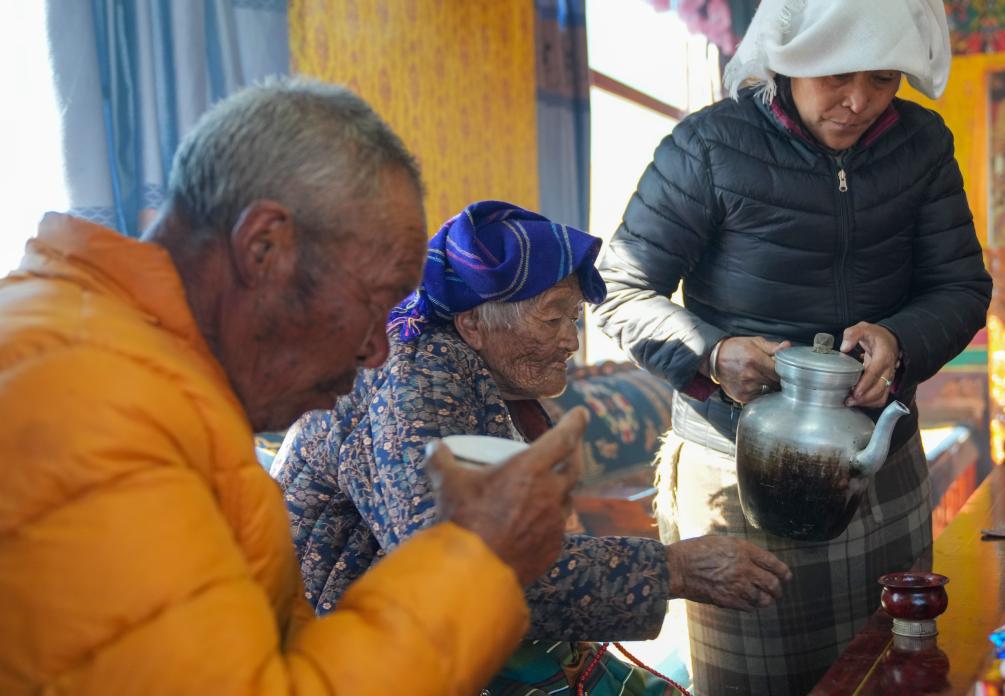 贡觉曲珍(中)和家人在家中喝酥油茶(3 月 6 日摄)。