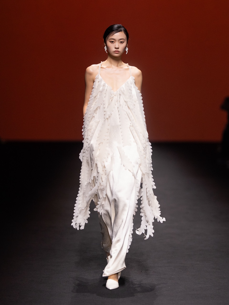 在结构与材质上,系列强调肌理的生成逻辑:通过不同纱线混织,模拟墙面与树皮的触感;同时以雪纺与醋酸、欧根纱形成虚实对照,使轻盈与厚重并置。花卉元素并未直接复刻,而是以更抽象的方式融入面料与纹样之中,延续品牌一贯的克制浪漫。另一条叙事来自游牧文化。围裹式结构、立体口袋与流苏细节,使服装在都市语境中引入一种流动与迁徙的意象。