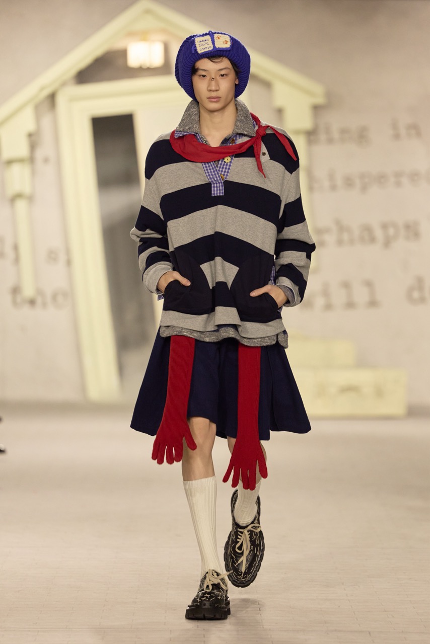 这种来自童年的自由与孤独,被转译为服装语言。柔软针织与旧化质感面料叠加,呈现出被时间磨过的触感;不对称廓形与拼接细节,则模拟孩子式的随意搭配,让造型在不规则中形成个人表达。层次结构强调包裹与保护,也回应秋冬语境下的温度感。