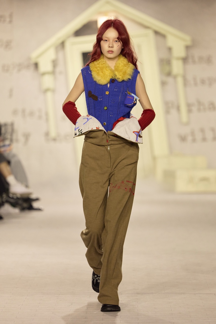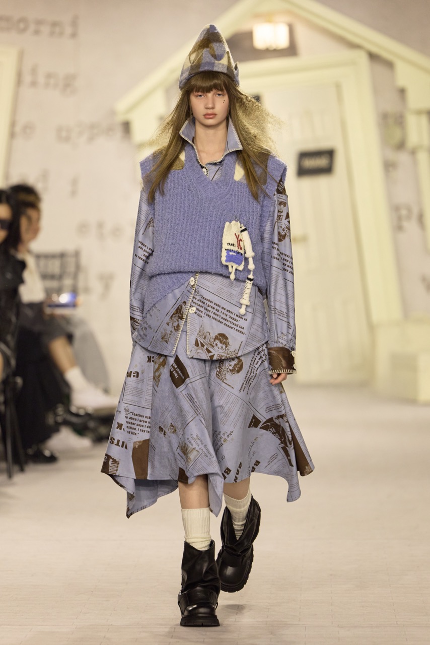 YANAG以“当我长大后”为题,将一个日常提问转化为整季叙事的起点。秀场被构建为一本被时间翻开的旧书。泛黄的故事页铺满墙面,散落的童话房子装置让空间介于现实与想象之间,模特穿行其中,形成一种安静却带有冒险感的氛围。