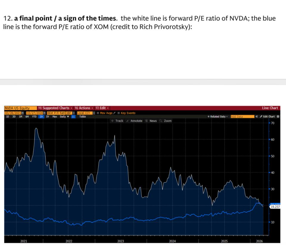 高盛对冲基金业务主管 Tony Pasquariello 也在最新写给客户的笔记中分享了一张有趣的图表——在 AI 抛售、战争冲击下,英伟达(NVDA)的远期市盈率(P/E)已经开始低于石油巨头埃克森美孚(XOM)。这在几年前是完全不可想象的事情。