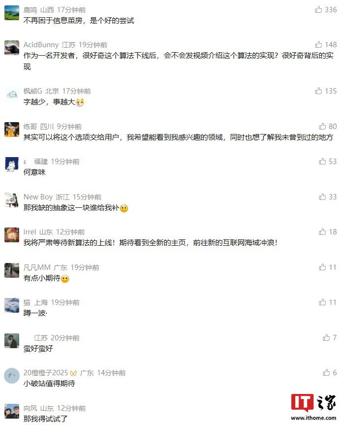 此次 B 站官宣下线猜你喜欢算法将与主流推荐算法对垒。哔哩哔哩官方公众号推文的评论区有用户对此表示赞同,认为:"不再困于信息茧房,是个好的尝试。"