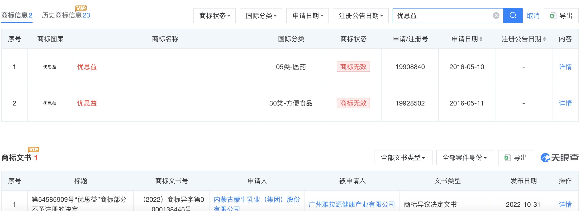 另有商标文书信息显示,2022年内蒙古蒙牛乳业集团曾对广州雅拉源健康产业在婴儿食品、婴儿配方奶粉等品类使用该商标提出异议,双方商标已构成使用于类似商品上的近似商标,商标争议裁决对第54585909号“优思益”商标部分不予注册。