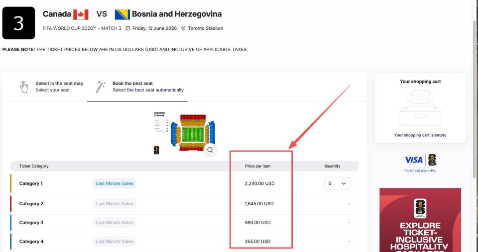 例如当地时间 6 月 12 日的小组赛加拿大对阵波黑,最低票价 355 美元,折合人民币 1755 元,最高票价 2240 美元,折合人民币 15417 元。