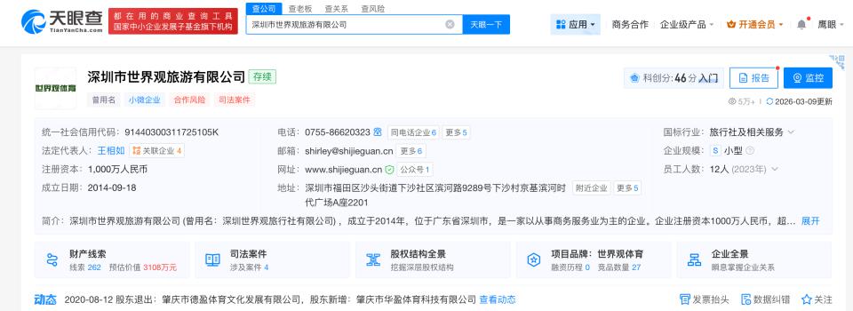 天眼查显示,世界观体育背后关联公司为深圳市世界观旅游有限公司,成立于 2014 年 9 月,注册资本 1000 万元,法定代表人为王相如,公司主要从事票务服务、旅游业务等。