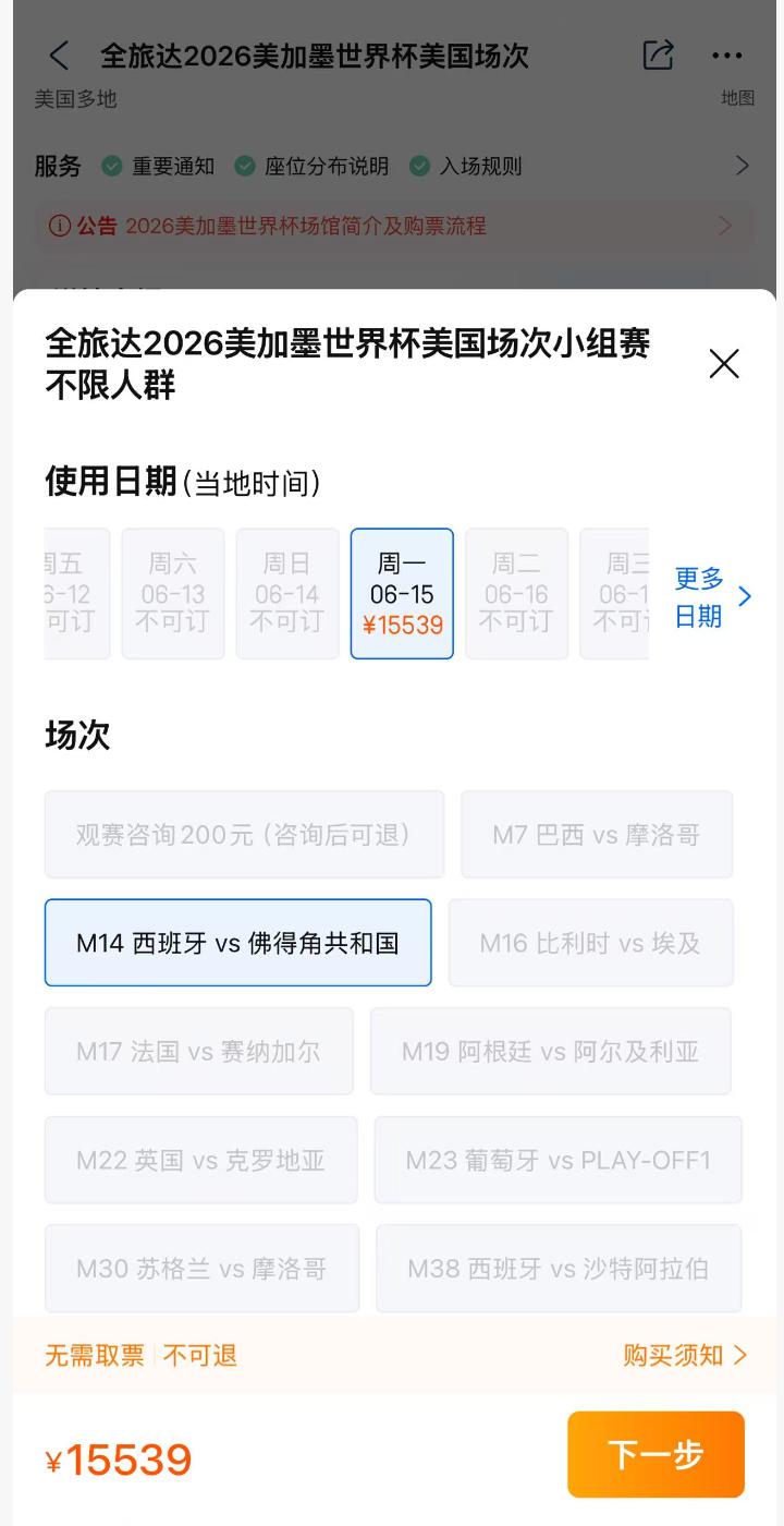 另外,在携程上也有旅游观赛票,例如 6 月 15 日的一场西班牙比赛,价格超过 15000 元。