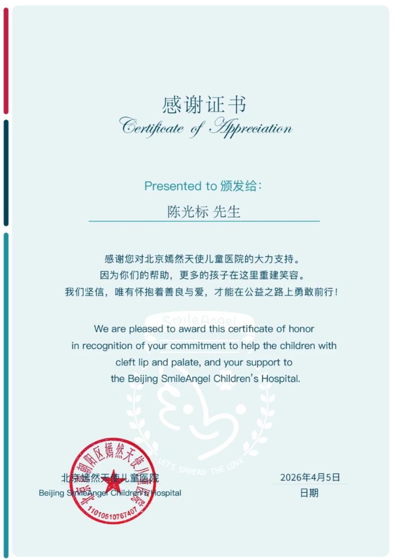 4 月 7 日," 北京嫣然天使儿童医院体检中心 " 官方账号发文感谢陈光标对嫣然医院的支持,并发布了颁发给陈光标的感谢证书。