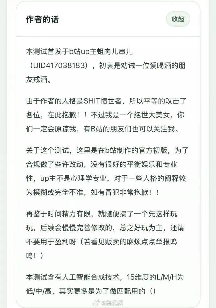 作者同时说明,自己并非心理学专业,测试为 B 站发布的初版,为合规已做过部分调整," 没有很好的平衡娱乐和专业性,up 主不是心理学专业,对于一些人格的阐释较为模糊或完全不准,如有冒犯非常抱歉 "。