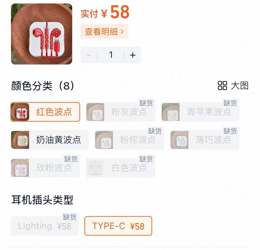 界面新闻记者在淘宝平台上按着销量搜索发现,包括倍思等品牌有线耳机销量都在上万,价格在十几元到几十元不等。另外,受到年轻人追求时尚、个性化需求的影响,一些色彩丰富、具有设计元素的有线耳机也受到欢迎。比如一款售价58元的波点有线耳机,销量超过了千人,具体页面显示除了红色波点、奶黄色波点款式外,其他配色均已缺货,客服回复暂时不确定什么时候能补货。