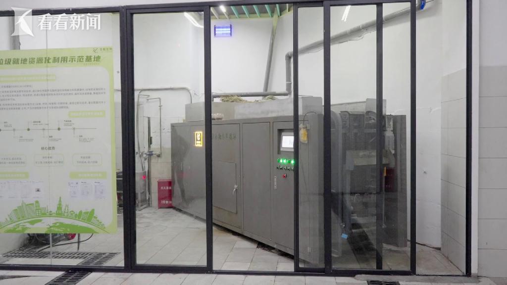 而进入回收箱里的湿垃圾,则会在小区保洁分拣好后,被倒入地下车库里的这个大家伙,经过 16 个小时后,每吨湿垃圾就能转化为 200 公斤有机肥,就地用于社区绿化。