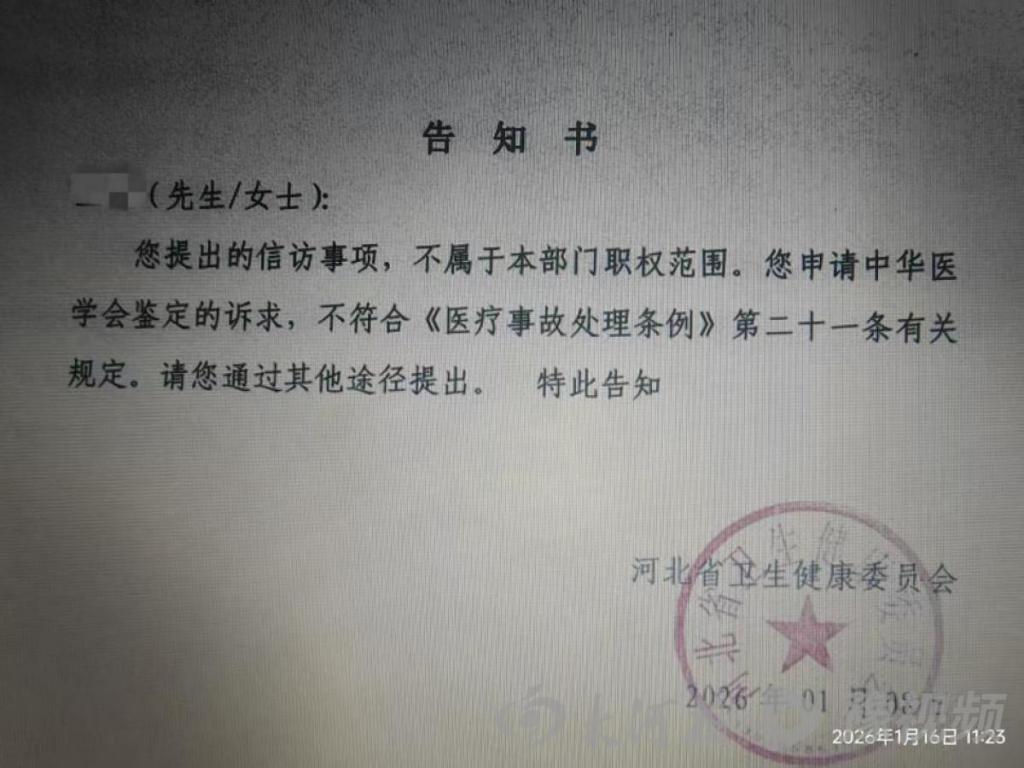 2026 年 1 月,家属通过河北省卫生健康委(以下简称河北卫健委)提出诉求,希望申请中华医学会进行鉴定。河北卫健委回复称,其信访事项不属于该部门职权范围,不符合相关规定,要求家属通过其他途径提出。