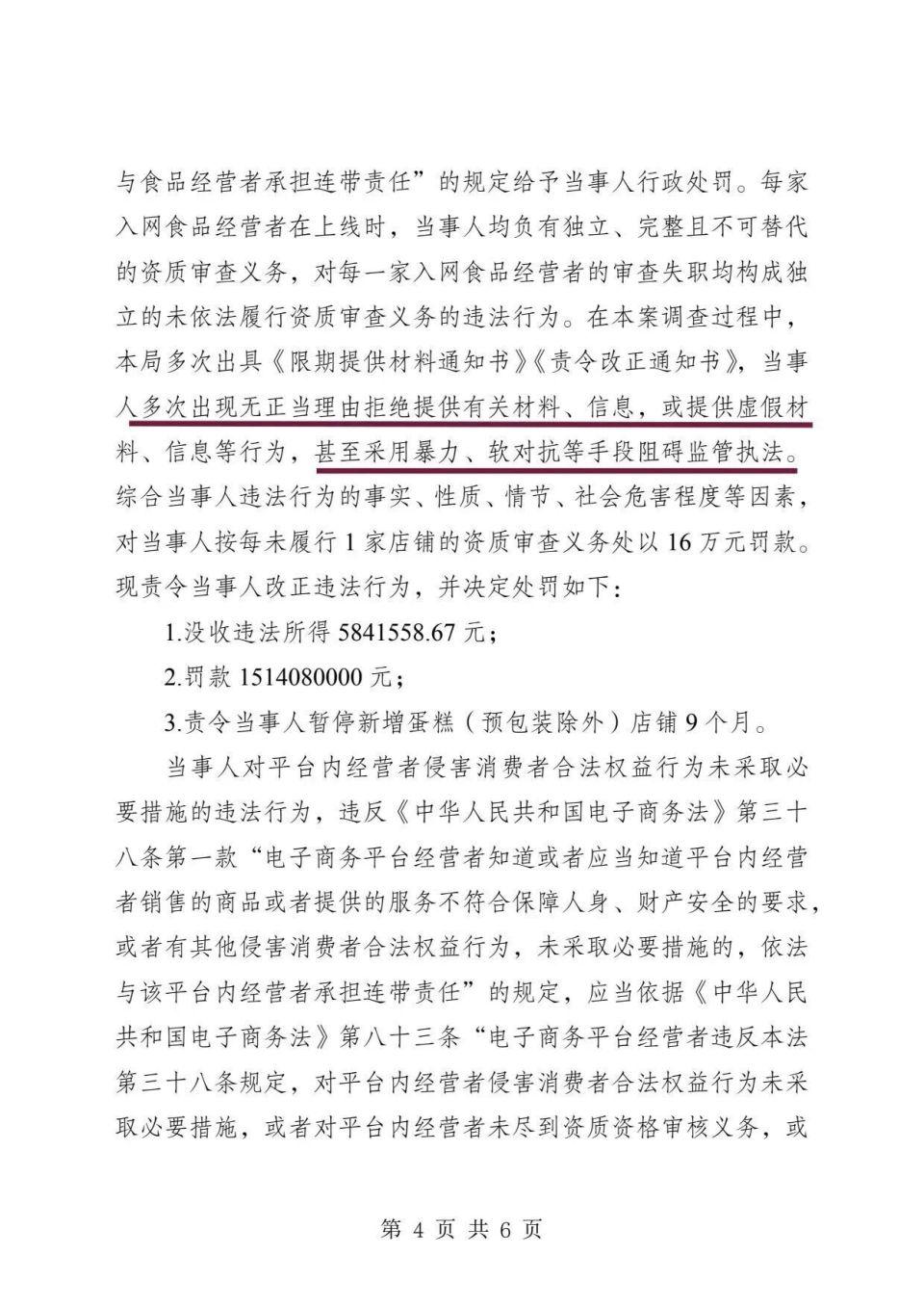 处罚决定书用严厉的措辞指出,在案件调查期间,拼多多多次无正当理由拒绝提供材料、提供虚假材料,甚至采用了暴力、软对抗等手段阻碍执法人员履行职责。