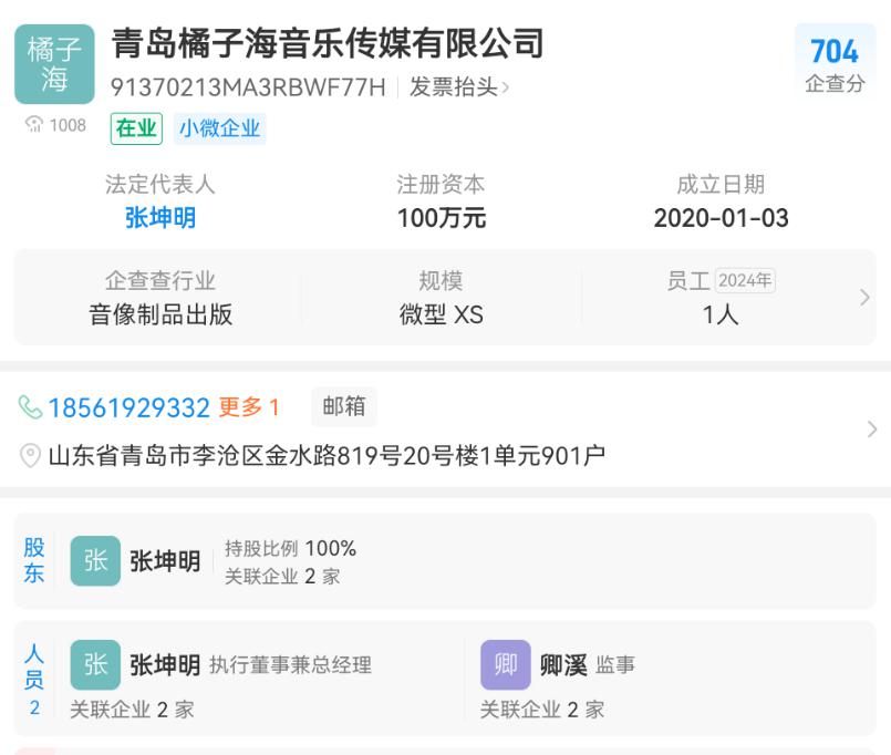 据企查查,橘子海乐队关联运营公司青岛橘子海音乐传媒有限公司成立于 2020 年 1 月 3 日,公司股东、法定代表人为张坤明,注册资本 100 万元。