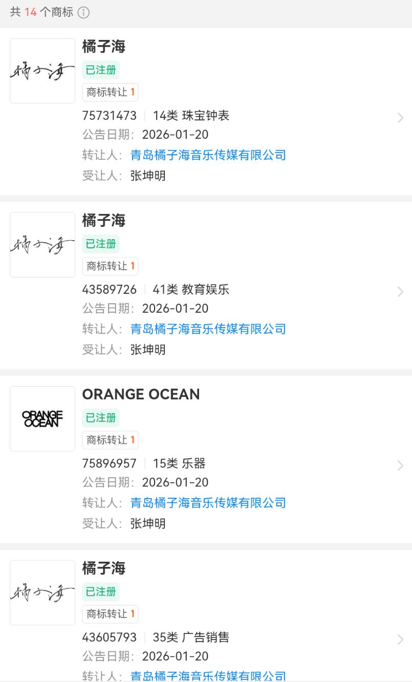 同时,该公司历史商标信息显示,其也曾成功注册过多个 " 橘子海 "、"ORANGE OCEAN" 商标,类目涵盖广告销售、乐器、教育娱乐以及珠宝钟表等。不过,所有这些商标均为转让状态,受让人为张坤明。