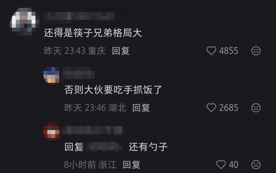 有网友表示 " 还得是筷子兄弟格局大 ",随后紧接着有人接茬:" 否则大伙要吃手抓饭了 ";