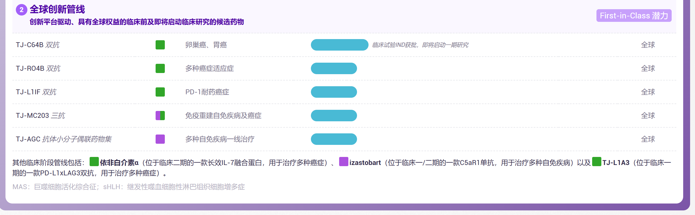 目前,天境生物正聚焦推进普那利单抗和尤莱利单抗(自研CD73抗体,赛诺菲负责商业化)等多个注册性临床或后期临床;第二梯队产品,如TJ-C64B、TJ-L1IF、TJ-MC203等也将逐步进入临床开发阶段。