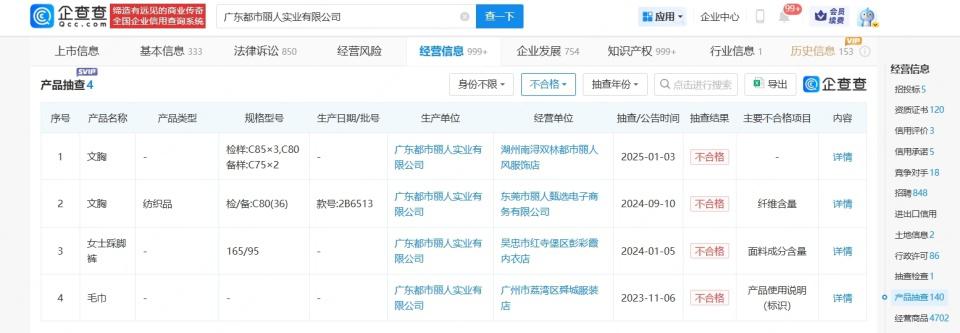值得注意的是,本次营销舆论争议之外,都市丽人还存在产品品控漏洞。据市场监管部门公开抽检信息及企查查公示数据显示,2023 年至 2025 年,该公司曾有文胸、踩脚裤、毛巾等产品被检出不合格,不合格项目包括纤维含量、面料成分含量、产品使用说明(标识)等。