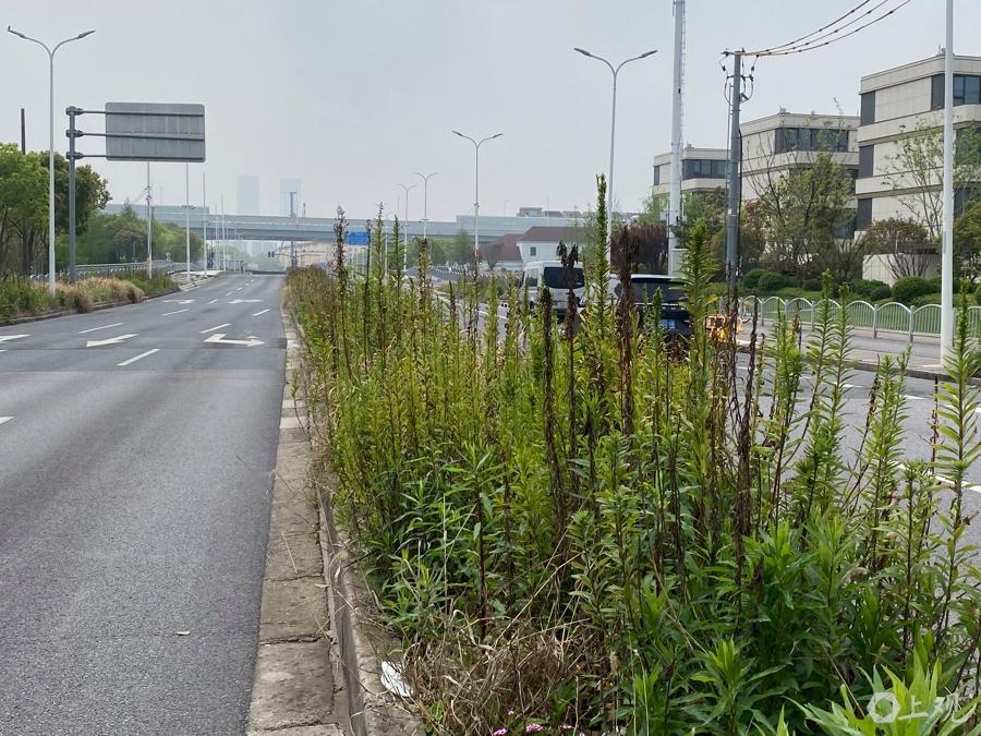 除了垃圾遍地,该路段部分绿化隔离带还被杂草彻底占据。在金港路靠近龙东大道的一侧,一人多高的杂草密密麻麻、长势凶猛,枝繁叶茂间将整个绿化带完全遮蔽。这些杂草种类繁杂,部分茎秆粗度堪比手指,远远望去如同一片荒芜的野草地,与周边崭新的柏油马路、现代化写字楼形成鲜明反差,显得格格不入。
