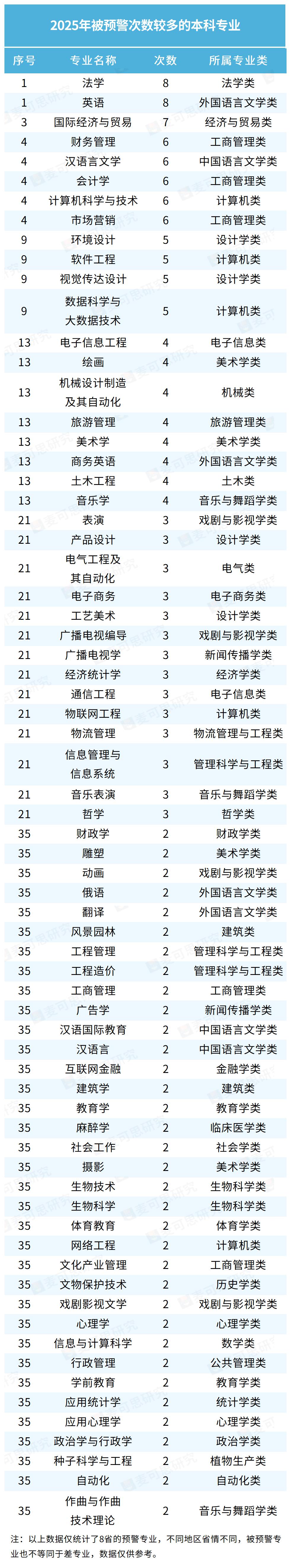 2025 年被预警次数较多的本科专业 / 图源:麦可思研究