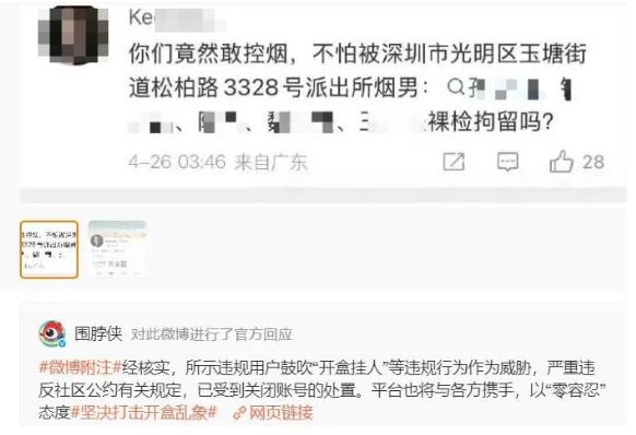 26 日下午,微博社区观察员官方账号 " 围脖侠 " 回应:" 经核实,所示违规用户鼓吹‘开盒挂人’等违规行为作为威胁,严重违反社区公约有关规定,已受到关闭账号的处置。平台也将与各方携手,以‘零容忍’态度坚决打击开盒乱象。" 记者搜索该账号,发现已无法显示。