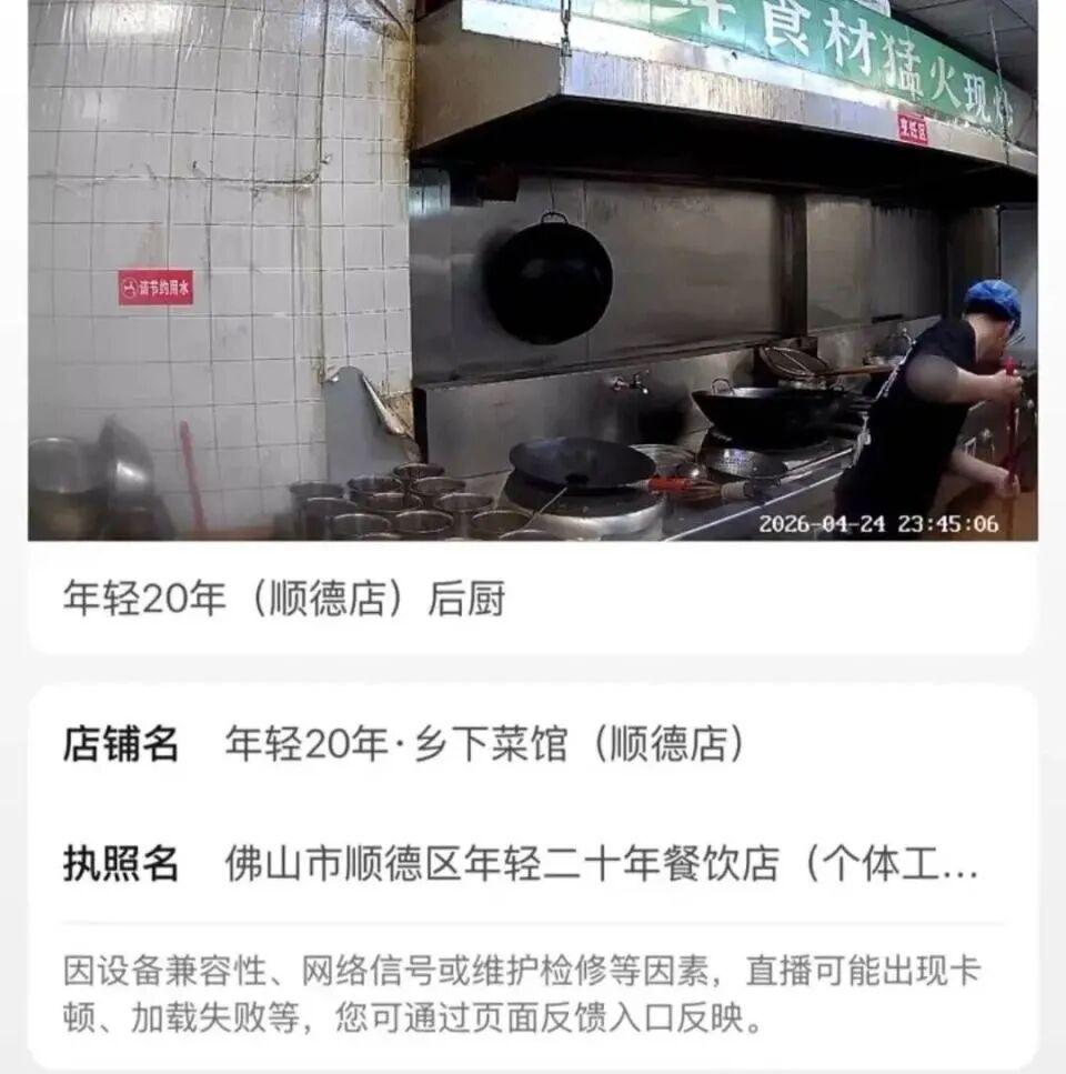 冯先生是 24 日晚通过在外卖平台查看 " 明厨亮灶 " 直播时发现后厨工作人员的相关操作。其提供的录屏视频中," 年轻 20 年 · 乡下菜馆(顺德店)" 一名穿黑色短袖、右臂花臂的工作人员,正在用蘸有清洁剂的红色扫把清洗灶台台面及外侧,这一过程中,他还不时洗涮扫把。但由于角度关系,从视频中无法辨认扫把是放进了灶台中间的那个锅中还是旁边的水槽里。