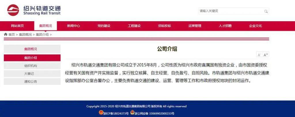 据绍兴轨道交通集团官方网站介绍,公司性质为绍兴市政府直属国有独资企业,由市国资委授权经营有关国有资产并实施监督,实行独立核算、自主经营、自负盈亏、自担风险。绍兴轨道集团与绍兴市轨道交通建设指挥部办公室合署办公,主要负责轨道交通的建设、运营、管理等工作和市政府授权地块的封闭运作。