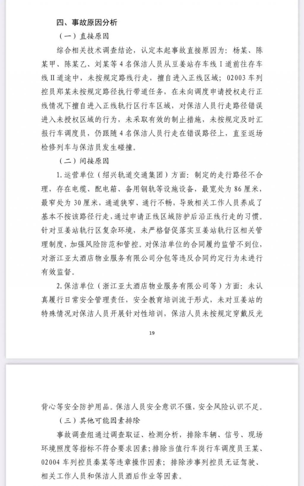 调查认定,绍兴市 "9 · 13" 轨道交通较大事故是一起因涉事企业安全风险辨识管控不到位、从业人员违反安全操作规程等导致 3 人死亡、1 人重伤的生产安全责任事故。致 3 死 1 伤,浙江绍兴 "9 · 13" 轨道交通 2 号线列车撞击事故调查报告发布:直接原因为 4 名保洁人员未按规定路线行走,擅自进入正线区域。