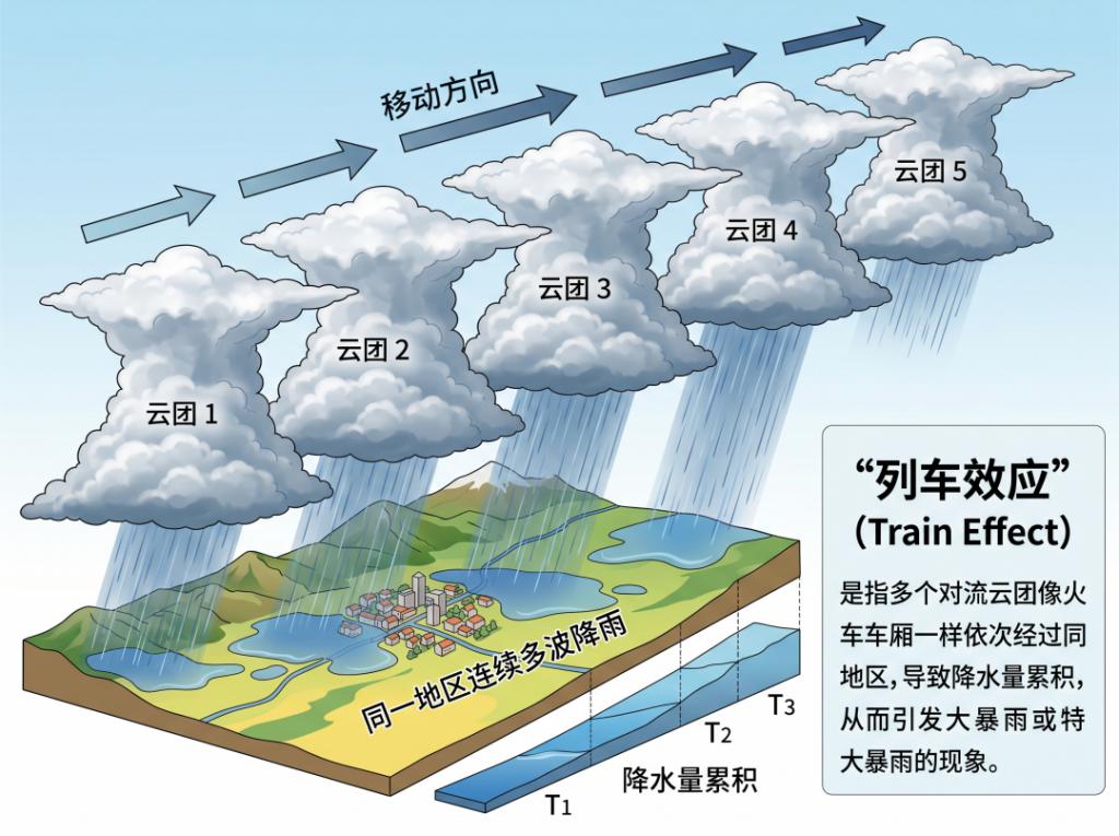 " 列车效应 " 指多个对流云团像火车一样依次经过同一地区,导致降水量累积,从而引发大暴雨或特大暴雨的现象。