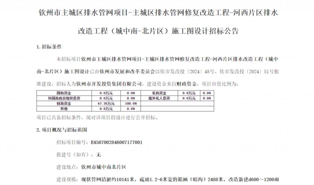 2026 年 3 月 23 日,钦州市新公布了一则中标公告,该项目是针对主城区排水管网的修复改造和综合整治,包括改造雨水管道 19km 和新建单孔箱涵和双孔箱涵,项目概算投资额 136.56 万元。