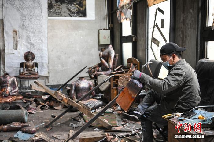 图为西藏雪堆白技工学校金属技艺教师罗布顿珠,正在专注进行金属锻造创作。贡嘎来松 摄