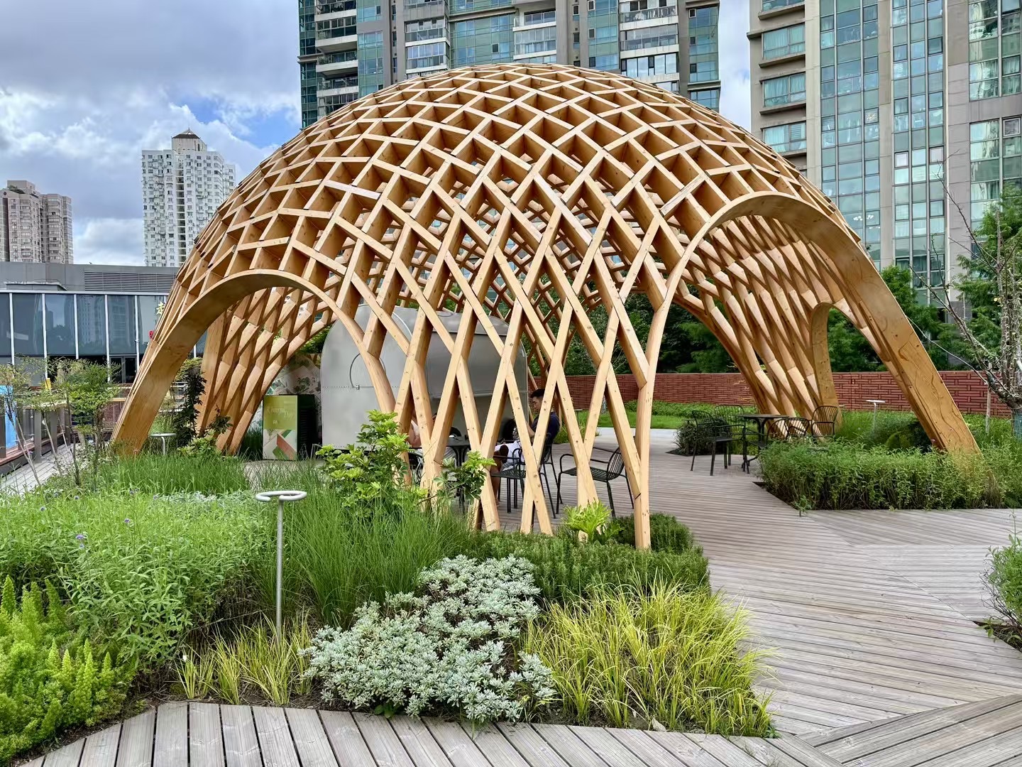 PAC最瞩目的地标是坐落在二楼露台的“大蛋壳”。区别于大型的钢铁怪物,木结构更加切中“丛林”的题眼,在夏天,“蛋壳”隙缝中局部投下的阴影也能发挥很好的降温作用,因此成了人群的休憩地。钱诗韵的灵感取自“亲生命”中的术语“庇护所(shelter)”,“人类最早的穴居就是在山洞,出现shelter之后,一切日常性的事件有了发生的地点,你能做活动,不然就去躺着,发呆也行。”