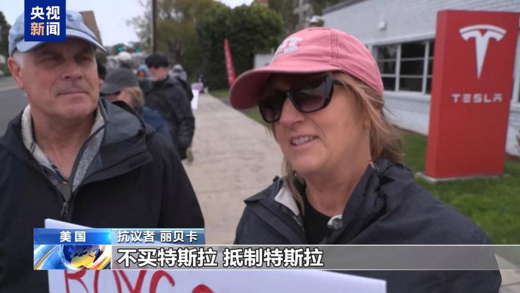 抗议者 丽贝卡:我在这里抗议,是因为埃隆 · 马斯克正在一点点地、非法地、违宪地摧毁美国政府,所以我们在这里抗议。不买特斯拉,抵制特斯拉,不支持马斯克。