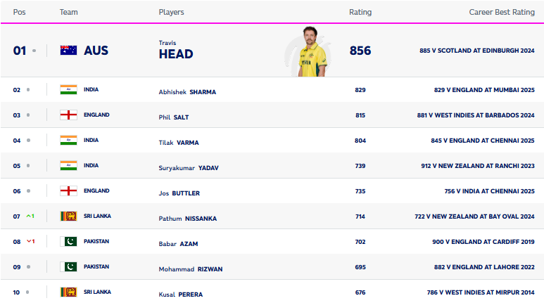 澳大利亚的特拉维斯·海德继续领跑T20I击球排名,印度的阿比谢克·夏尔马和英格兰的菲尔·索尔特紧随其后。