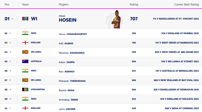 西印度群岛的旋转手阿卡尔·侯赛因仍然是排名第一的T20I保龄球手。