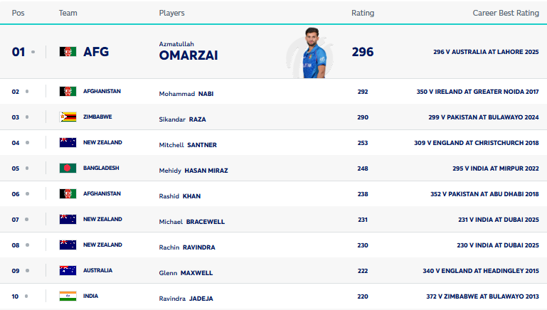 阿富汗的阿兹玛图拉·奥马尔扎伊(Azmatullah Omarzai)在全能型学生排名中保持首位。