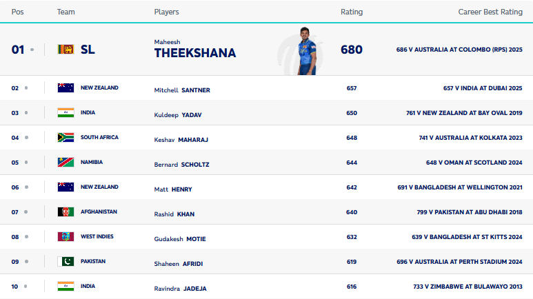 巴基斯坦的沙欣·阿夫里迪(Shaheen Afridi)仍然稳居第九。