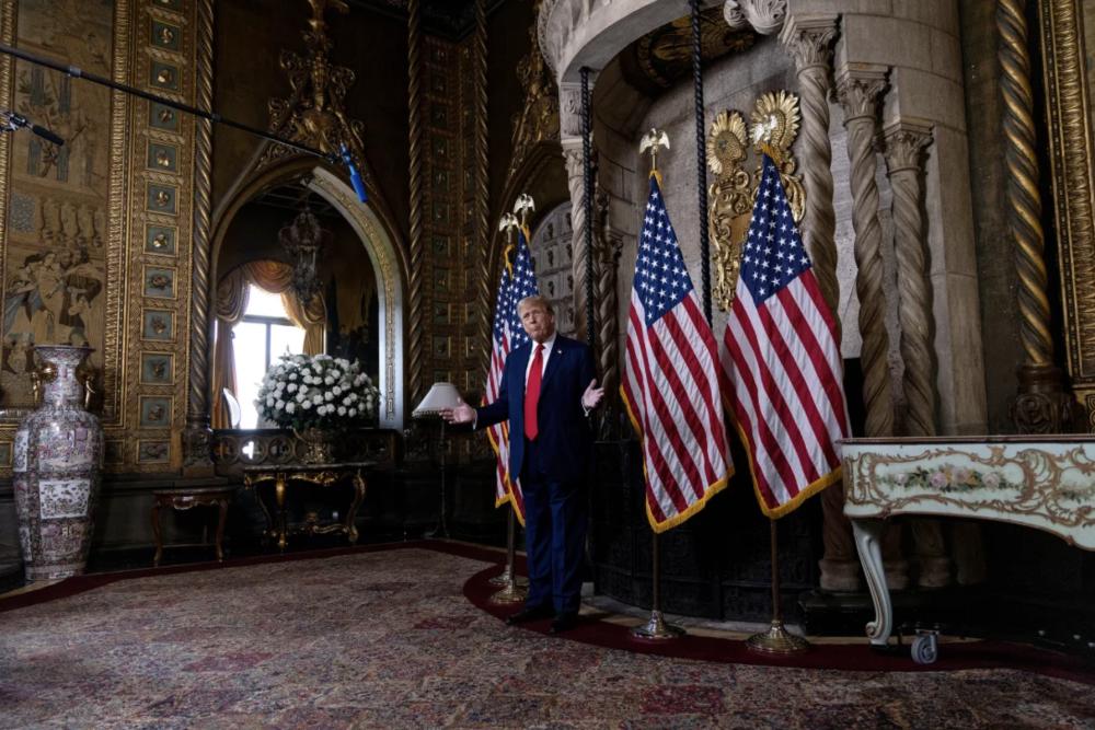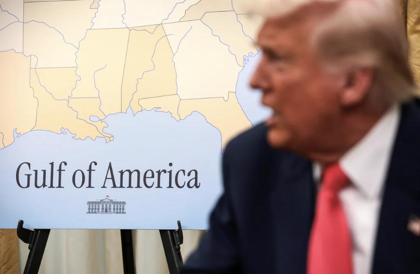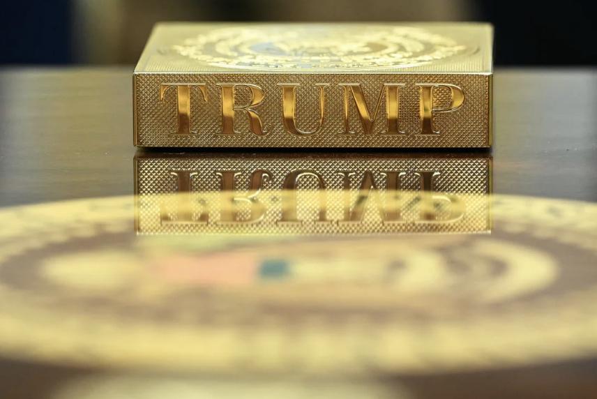 旁边,一个标有他重新命名的 " 美国湾 " 水域的标牌永久地放在一个画架上,金杯放在窗户上方和沿墙的凹槽中。一个看起来很重的金色镇纸放在咖啡桌上,顶部刻有总统印章,侧面印有 "TRUMP" 字样。有时,一些客人会用它作为杯垫。