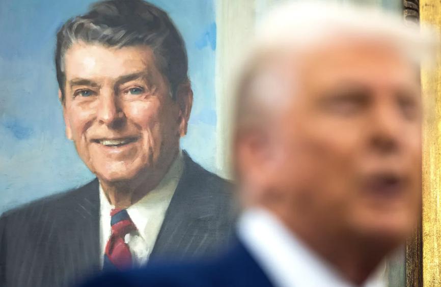 一幅大型的罗纳德 · 里根油画肖像现在占据了特朗普办公桌左侧的显眼位置。在房间的另一端,一幅新的华盛顿肖像悬挂在壁炉上方:不再是特朗普 1 月抵达时挂在那里的那幅小画,而是一幅由查尔斯 · 威尔森 · 皮尔于 1776 年创作的威严肖像,展示了这位第一任总统手持剑的形象。