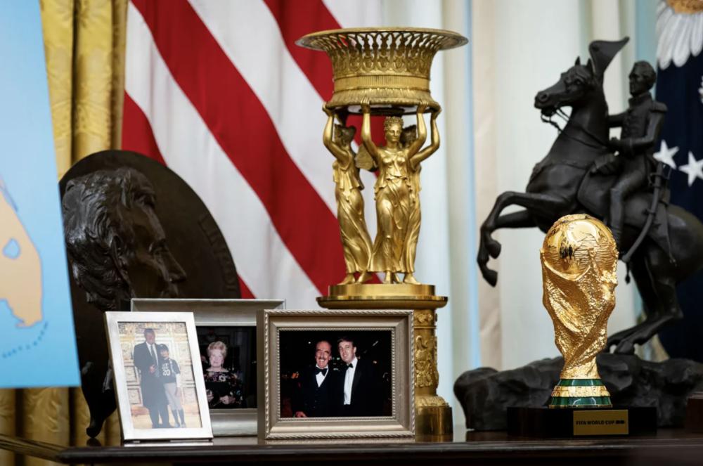 在他办公桌后面的桌子上,摆放着一个闪亮的金色国际足联世界杯奖杯复制品,被称为朱尔斯 · 里米特奖杯。特朗普经常谈论下一届世界杯,该赛事将于 7 月在北美举行,大部分比赛在美国进行。