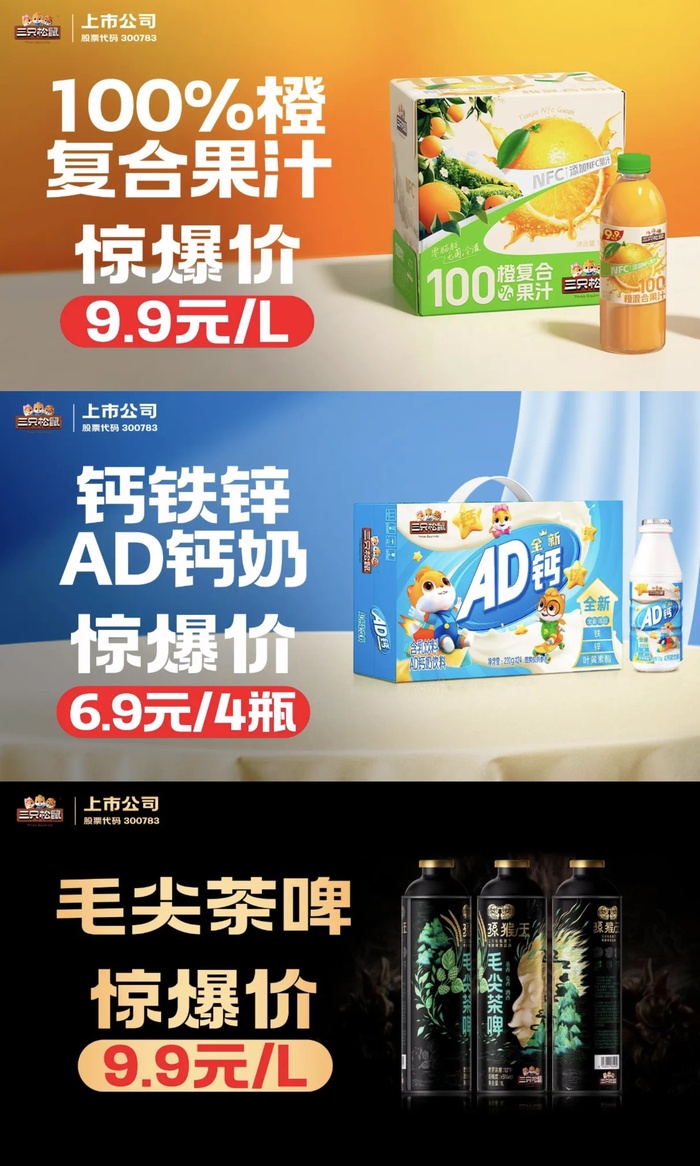 目前,三只松鼠已推出100%橙复合果汁、钙铁锌AD钙奶、毛尖茶啤三款产品,售价均低于10元。其中,橙果汁售价9.9元/L,卖点为采用巴西圣保罗黄脐橙+NFC非浓缩还原技术,配料表仅“水+果汁”;AD钙奶规格220g每瓶,售价6.9元/4瓶,添加铁、锌、叶黄素酯,瞄准儿童智力发育与护眼需求;毛尖茶啤售价9.9元/L,是三只松鼠旗下又一独立子品牌“孙猴王”,主打东方茶啤。