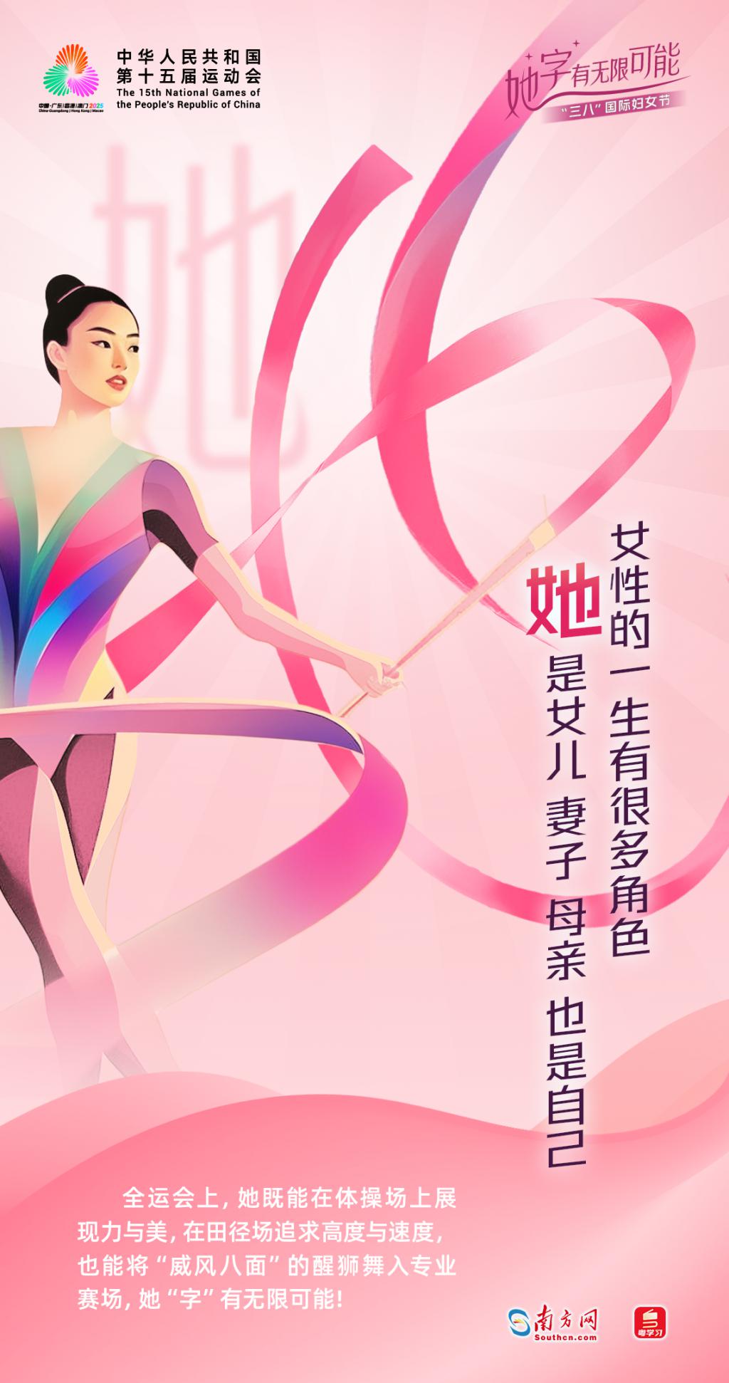 首页 > 生活 她“字”有无限可能|全运赛场上,“她”力量闪闪发光 2025 年 3 月 8 日是第 115 个 " 三八 " 国际劳动妇女节,祝广大女性朋友们节日快乐!今年 11 月,万众瞩目的第十五届全国运动会将由粤港澳三地共同举办。历届全运赛场上," 她 " 力量闪闪发光,女性运动员们向全世界展现出她的无限可能。值此佳节,让我们再次为女性运动员、女性同胞们送上最诚挚的祝福!出品:南方网 粤学习统筹:农海燕策划:陈婷 郭晓桦设计:孔韵彤